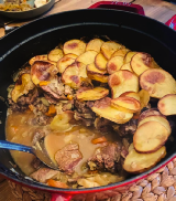 Was de aardappels en snijd deze in plakjes. Wanneer de 2,5 uur voorbij zijn dek je het vlees af met de aardappel schijfjes. Verwarm de oven voor op 160 graden. Plaats de pan met deksel voor 90 minuten in de oven. De laatste 20 minuutjes haal je de deksel van de pan zo krijgen de aardappelschijfjes een mooie goudbruine kleur en worden ze krokant!